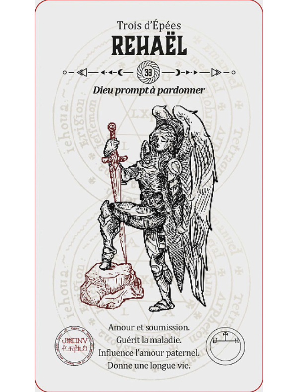 Grâce au livre d’accompagnement, vous découvrirez les sigils originaux, les sceaux d’invocation et les pentacles d’anciens grimoires des chœurs de la hiérarchie angélique, ainsi que leurs noms divins, afin d’invoquer dans votre vie les énergies pures de ces êtres sacrés. Montez sur le Chariot avec l'Ange Michel, invoquez la Lune avec Gabriel, rencontrez Elemiah la Reine des Bâtons, ou suivez la sagesse du Pape avec l’Ange Hazel.